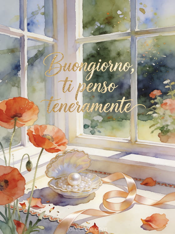 Invia un messaggio poetico di buongiorno per lei con delicate lettere rosa ad acquerello, papaveri, una coppetta portagioie perlata e nastri di raso in una veranda luminosa. Scopri anche messaggio di buongiorno a un'amica, cartolina floreale di buongiorno o bella cartolina virtuale gratuita di buongiorno.