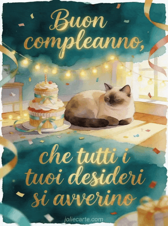 Condividi un biglietto accogliente di compleanno ad acquerello con un gatto exotic shorthair accoccolato accanto a una torre di cupcake con nastri e ghirlande luminose in una stanza soleggiata, con coriandoli e stelle filanti. Scopri anche un compleanno di suo figlio, un buon compleanno mio figlio gif o un biglietto di compleanno gratuito per mio figlio.