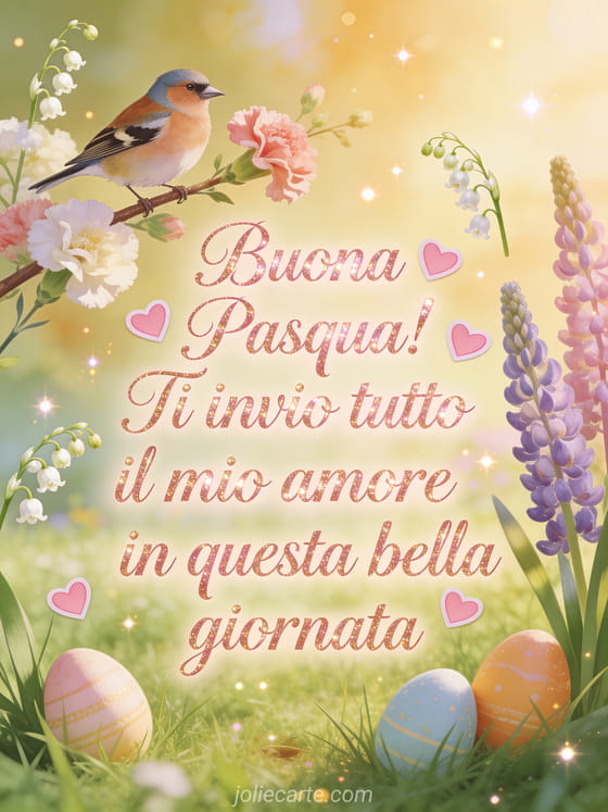 Invia questo bel messaggio di Pasqua ai tuoi cari, con un ciuffolotto appollaiato su un ramo di garofani e lupini, uova di Pasqua nascoste nell'erba verde fresca e scintillii dorati. Un'illustrazione romantica e calda. Scopri anche un'immagine di Pasqua gratuita, un biglietto di Pasqua per Facebook o un biglietto di Pasqua.