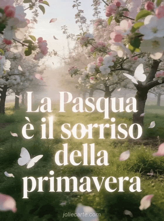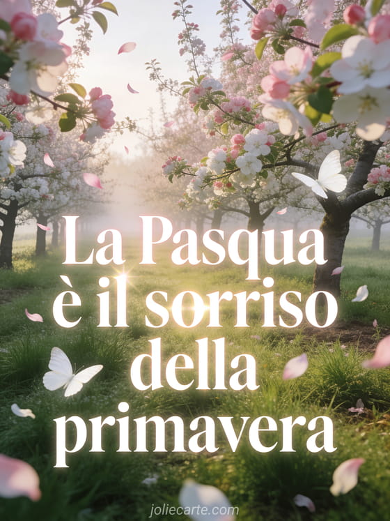 Trasmetti la dolcezza della Pasqua con questo messaggio poetico in un frutteto di meli in fiore, petali nel vento e farfalle bianche nella luce dorata del mattino. Scopri anche una citazione gioiosa di Pasqua o una fiori di Pasqua immagini.