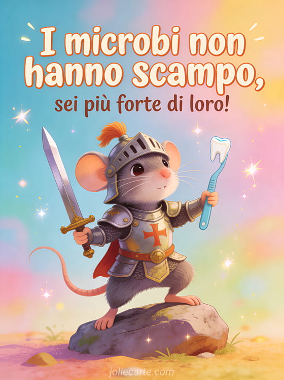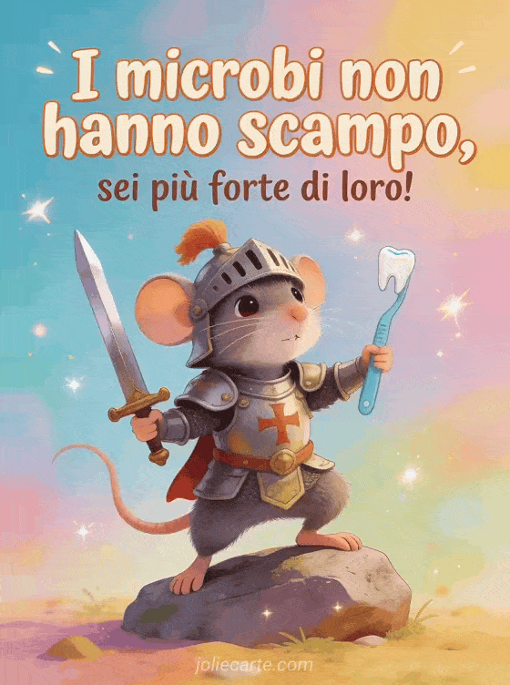 Invia un messaggio divertente e coraggioso di pronta guarigione a chi lotta contro la malattia. Questa incantevole cartolina con un topolino coraggioso in armatura da cavaliere solleverà il morale. Scopri anche una divertente cartolina del dottor Google o una divertente cartolina con topolino coraggioso.