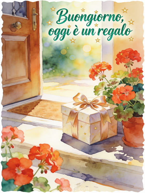 Invia una cartolina festiva di buongiorno con una scatola regalo avvolta con nastro di raso accanto a gerani luminosi su una soglia soleggiata. Scopri anche dei biglietti buongiorno, un messaggio di buongiorno semplice o un messaggio buongiorno cara.