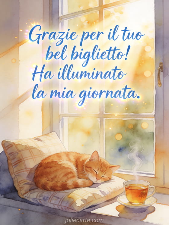 Esprimi la tua gratitudine con questo caloroso biglietto con un gatto rosso addormentato su un cuscino accanto a una finestra soleggiata con una tazza di tè fumante e raggi di sole dorati. Scopri anche un biglietto grazie per questo pensiero, un biglietto per ringraziare qualcuno per un biglietto o un biglietto il tuo biglietto mi ha commosso molto.