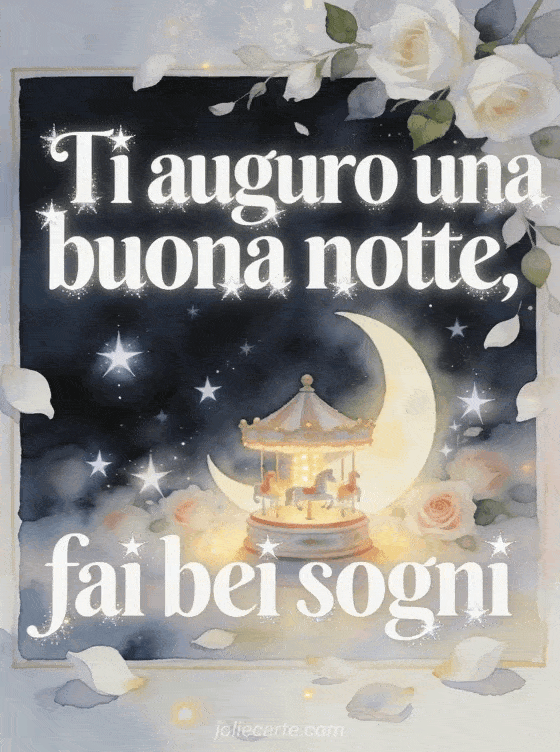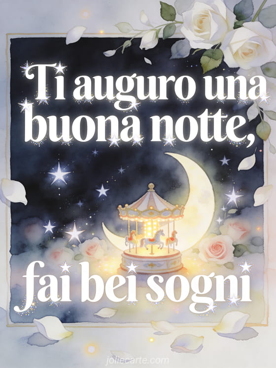 Condividi un dolce messaggio di buona notte con stelle luminose, petali di rosa bianca e un carillon a giostra sotto una luna crescente. Scopri anche buonanotte messaggio, piccolo messaggio per dire buona notte o bel messaggio della buonanotte.
