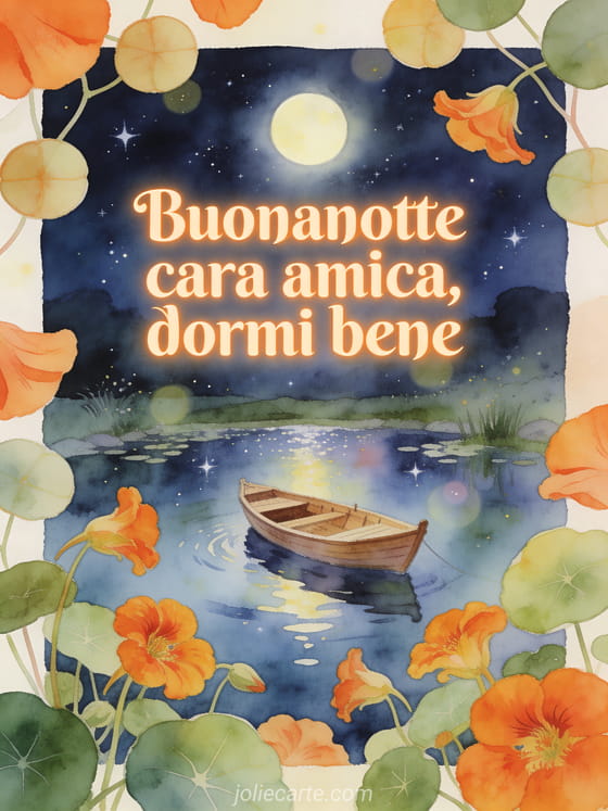 Invia un messaggio sereno di buonanotte a una cara amica con scritte albicocca calde, una piccola barca di legno su uno stagno riflettente, un cielo pieno di stelle, fiori di cappuccina, petali arancioni e bokeh morbido. Puoi condividere anche cartolina per augurare buona notte, buonanotte cartolina o carino messaggio della buonanotte.