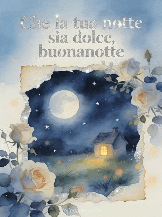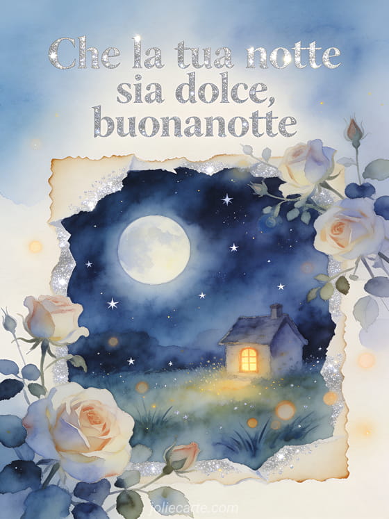 Condividi una notte tranquilla ad acquerello con rose antiche, un prato al chiaro di luna, una piccola casa con finestra illuminata, stelle e caldo bokeh. Scopri anche buona serata e buonanotte messaggio, messaggio di buonanotte per il tuo innamorato o messaggio tenero per dire buonanotte.