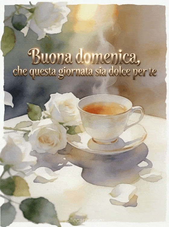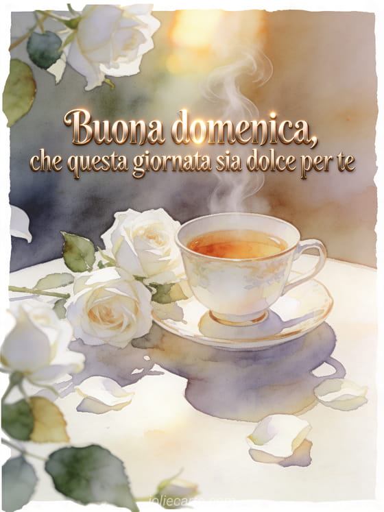 Offri un dolce messaggio di buona domenica con una delicata tazza di tè, rose bianche e luce calda ad acquerello. Scopri anche buona domenica immagine gratis, buona domenica sole gif o buona domenica con caffè immagine.