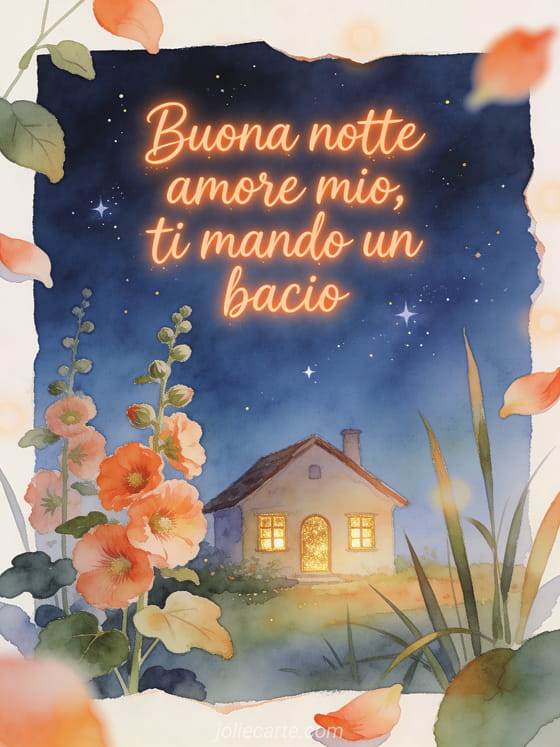 Invia un messaggio affettuoso di buona notte con calligrafia corallo, una casetta con finestre dorate, un cielo stellato e fiori di malvarosa. Scopri anche un biglietto per dire buona notte, una cartolina virtuale animata buonanotte o una cartolina animata buonanotte.