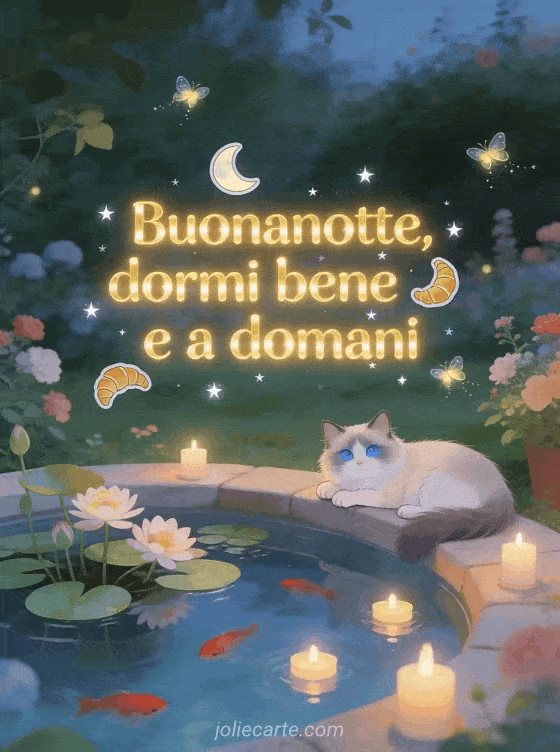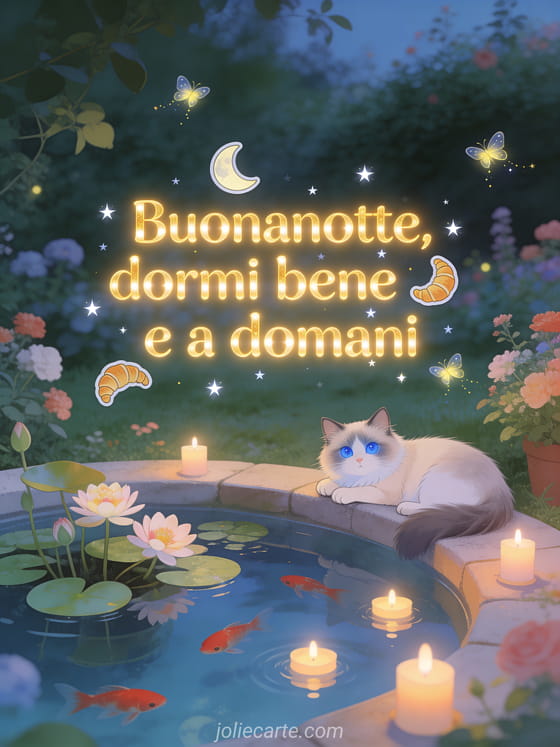Augura sogni d'oro con questo tenero biglietto della buonanotte con un gatto ragdoll dagli occhi azzurri sdraiato accanto a un laghetto con ninfee in fiore, candele galleggianti e lucciole danzanti in un giardino fiorito. Scopri anche un biglietto della buonanotte o un biglietto di buona serata e buonanotte.