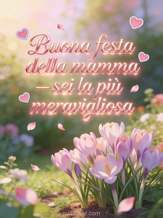Di' alla mamma che è la più meravigliosa con questo bellissimo messaggio per la festa della mamma con calligrafia oro rosa e crocus in un giardino da sogno. Scopri anche buona festa della mamma amore mio o immagini buona festa della mamma.