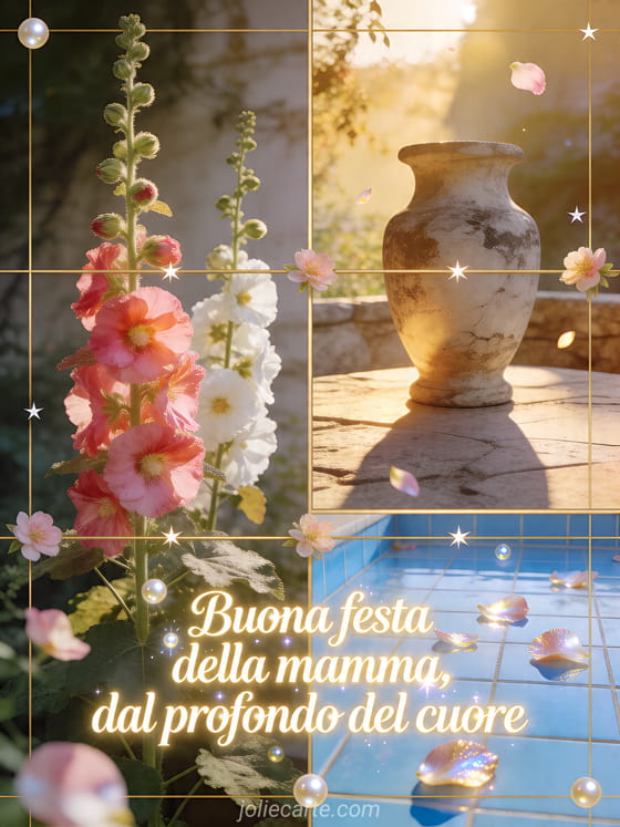 Condividi un biglietto elegante per la festa della mamma con scrittura luminosa, alte malvarose, un vaso di pietra al sole, una terrazza chiara e petali scintillanti. Scopri anche citazioni sulla festa della mamma, messaggi sulla festa della mamma o una fotografia della festa della mamma.