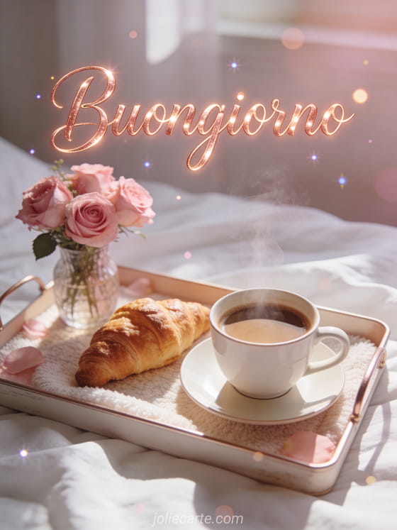 Un caldo e tenero biglietto di buongiorno con una tazza di caffè fumante accanto a un croissant fresco su un accogliente vassoio per la colazione con un vasetto di rose. Scopri anche un buongiorno messaggio, un sms buongiorno che fa innamorare o un buongiorno biglietto.