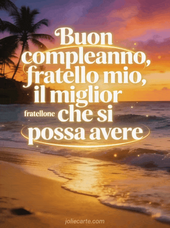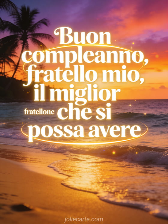 Festeggia tuo fratello con un tramonto tropicale fotorealistico sull'oceano, onde dolci, sabbia dorata e sagome di palme. Puoi condividere anche un buon compleanno fratellino, un compleanno fratellino o un compleanno fratello.