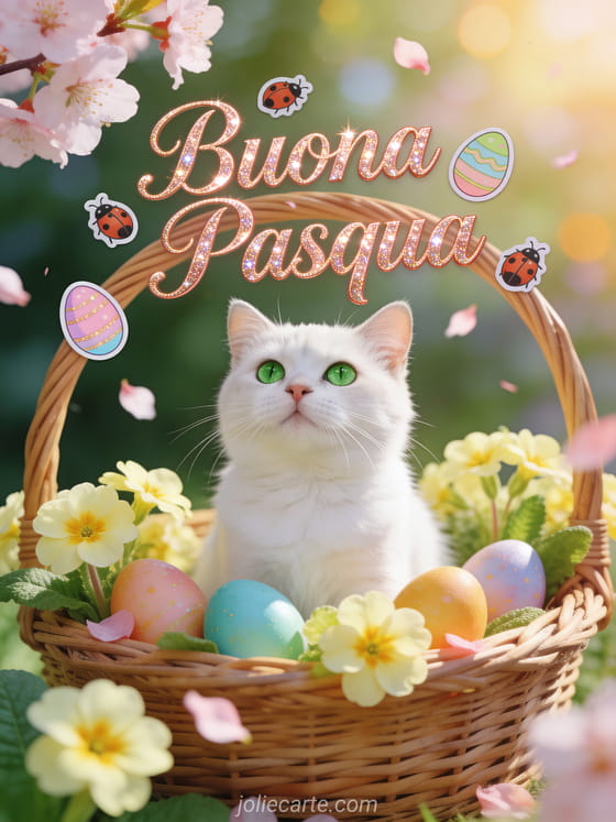 Crea una bella cartolina di Pasqua con questo modello gratis con un gatto bianco, uova dipinte e fiori di ciliegio. Scopri anche un coniglio di Pasqua o Buona Pasqua immagini.