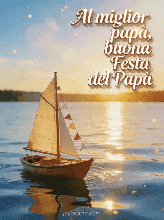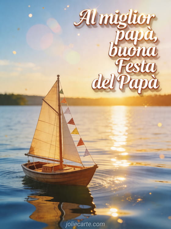 Usa un modello di biglietto per la Festa del Papà con elegante scritta bianca, una piccola barca a vela in legno che scivola su un lago blu calmo all'alba, riflessi dorati e piccoli festoni. Scopri anche foto festa del papà, un'immagine di festa del papà o parole tenere per la festa del papà.