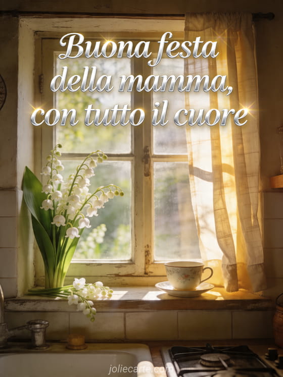 Condividi un augurio tranquillo con una finestra di cucina rustica ornata di mughetto, una tazza in porcellana e tende di lino illuminate dal sole. Puoi inviare anche come augurare buona festa della mamma alla propria mamma, foto per la festa della mamma o poema della festa della mamma.