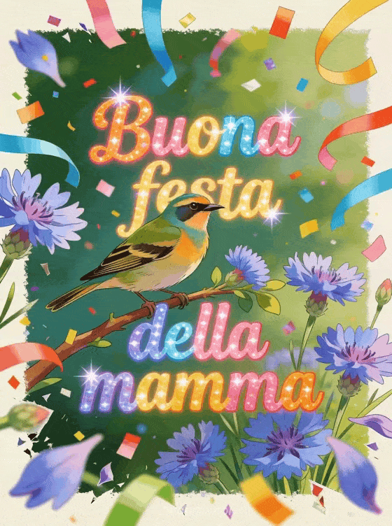 Festeggia con questo vivace biglietto di oggi è la festa della mamma. Un verdone posato su fiordalisi in fiore in una scena festosa con coriandoli colorati e stelle filanti. Scopri anche una buona festa della mamma o un biglietto di auguri festa della mamma.