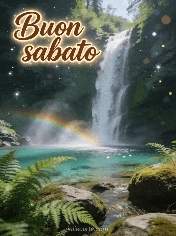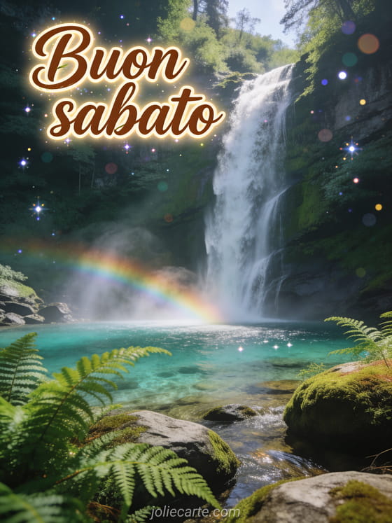 Condividi un saluto tranquillo di buon sabato con una cascata maestosa che scende in una piscina cristallina, felci rigogliose, rocce coperte di muschio e nebbia arcobaleno. Scopri anche buon sabato divertente, buon sabato gif o buongiorno sabato belle immagini.