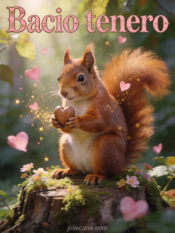 Condividi un dolce bacio tenero con questo biglietto gratis con uno scoiattolo fotorealistico, fiori di primavera e luce dorata soffusa. Scopri anche tenerezza cuore baci buona notte, immagine baci teneri o teneri baci d amore.
