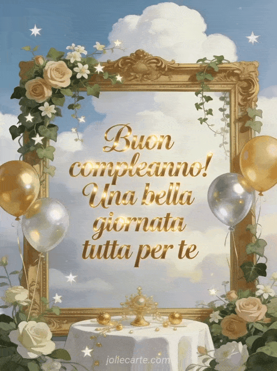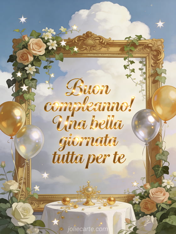 Invia bellissime parole di buon compleanno per rallegrare il giorno speciale di qualcuno. Una cornice dorata con rose, gelsomino e palloncini dorati crea un'atmosfera festosa calorosa. Scopri anche ti auguro un buon compleanno pieno di felicità o buon compleanno femminile.
