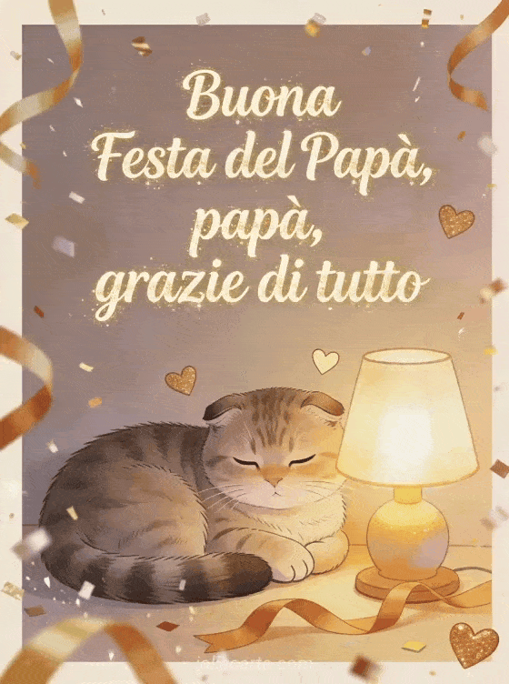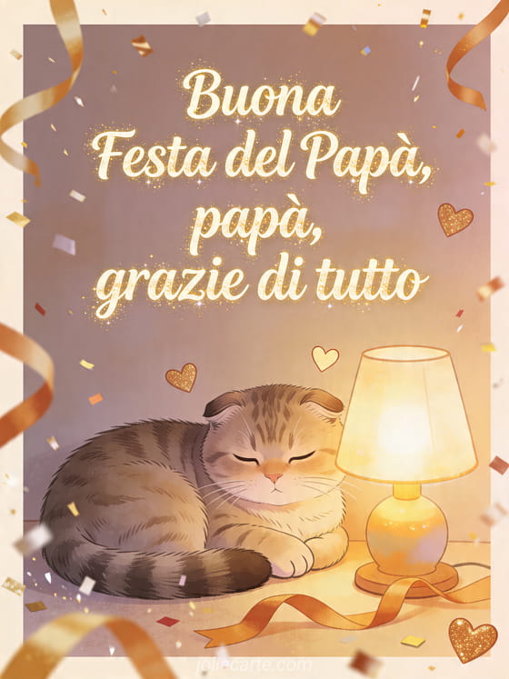 Invia parole dolci Festa del PapĂ con tenera scritta color crema, una calda illustrazione pastello di un gatto Scottish Fold acciambellato accanto a una lampada da tavolo luminosa, piccoli cuori, nastri ambrati e coriandoli di festa. Scopri anche augurare buona festa del papĂ a un amico, una gif originale per la Festa del PapĂ o amore mio mio caro buona festa del papĂ .