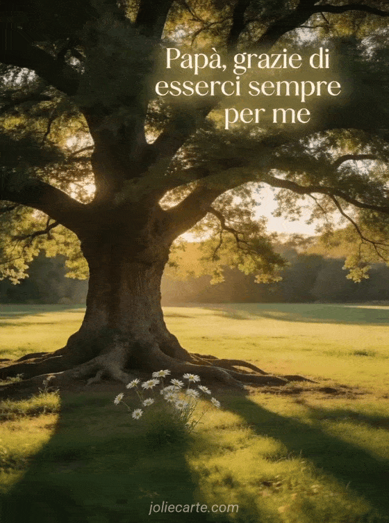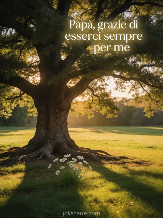 Condividi parole dolci per la festa del papĂ con un'immagine serena di una quercia secolare in un prato verde, luce dorata del tardo pomeriggio e margherite ai suoi piedi. Scopri anche una breve citazione per la Festa del PapĂ , buona festa papĂ immagine gratis o buona festa del papĂ .