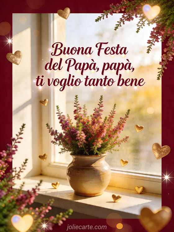 Invia parole tenere Festa del PapĂ con calligrafia bordeaux profonda, un vaso di ceramica realistico pieno di erica su un davanzale luminoso, piccoli cuori dorati e bokeh caldo e scintillante. Scopri anche buona domenica festa del papĂ , felice festa del papĂ amore mio o un testo d'amore per la Festa del PapĂ .