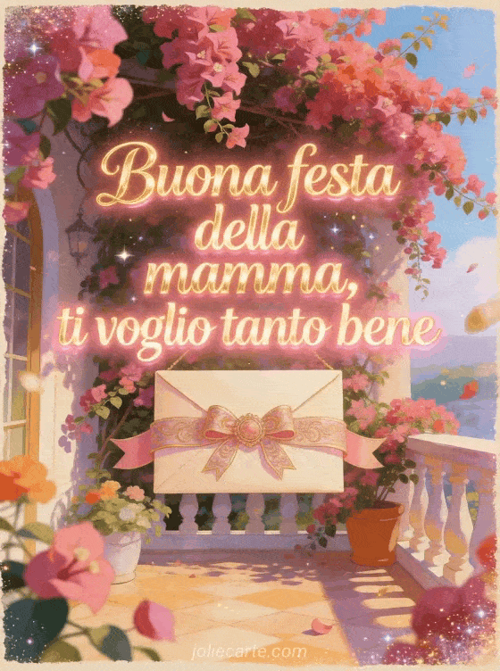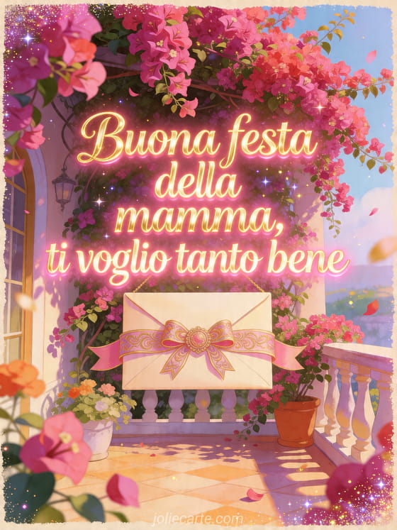 Condividi un saluto tenero per la festa della mamma con una busta con nastro, bouganville a cascata, colori festosi di terrazza e polvere scintillante. Scopri anche una poesia per la festa della mamma, buona festa della mamma immagini o una bella frase buona festa della mamma per una mamma.