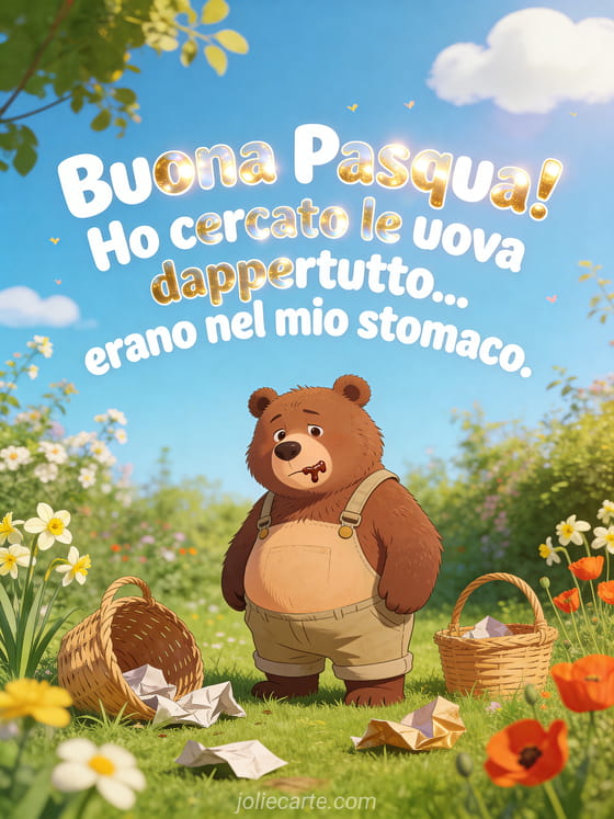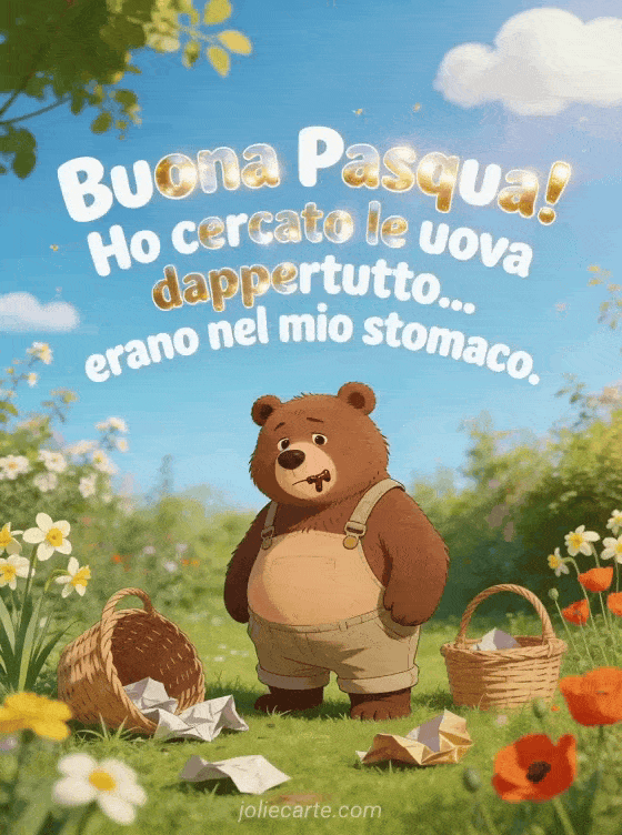 Festeggia con questo bellissimo biglietto animato. Invia questo messaggio di Buona Pasqua! Ho cercato le uova dappertutto... erano nel mio stomaco. ai tuoi cari gratuitamente. Scopri anche Pasqua divertente o Pasqua divertente.