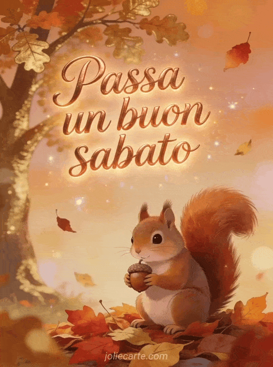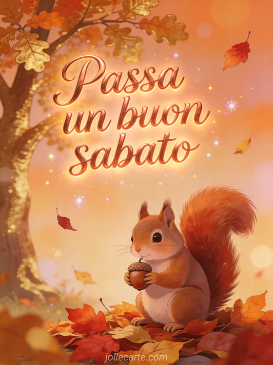 Condividi un saluto accogliente di sabato con uno scoiattolo carino che tiene una ghianda, foglie dorate e una luce autunnale soffusa. Puoi anche inviare buon sabato tanti baci o una bella immagine di buon sabato.