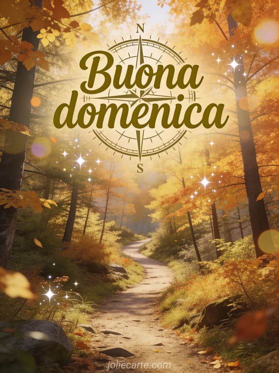 Condividi un saluto fresco di domenica con un sentiero nella foresta d'autunno, foglie dorate e un'atmosfera di avventura tranquilla. Puoi anche inviare buonissima domenica baci o buona domenica gif animate gif.