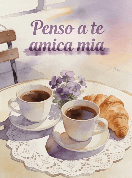 Invia questa gif gioiosa alla tua amica per farle sapere che pensi a lei. Due tazze di caffè affiancate su un tavolino da bistrot con un mazzolino di violette, croissant dorati e luce mattutina calda. Scopri anche un biglietto biglietti ti penso o un biglietto gif animate penso a te.