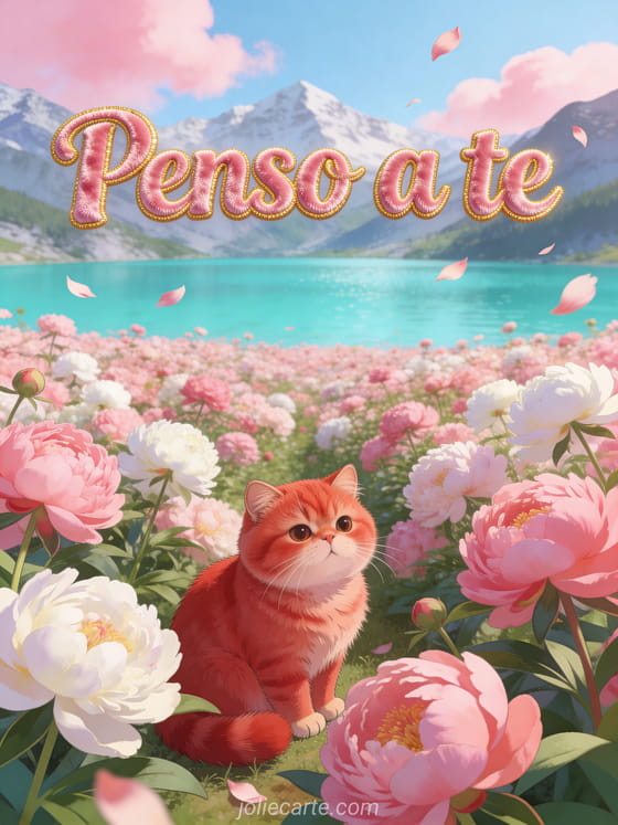 Penso a te con una rosa una cartolina tenera e colorata di penso a te con peonie e un gatto incantevole