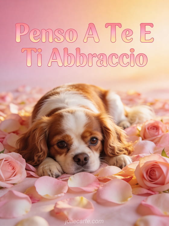 Invia questo tenero biglietto d'auguri con un adorabile cane Cavalier King Charles adagiato su un letto di petali di rosa. Scopri anche un biglietto penso a te e sogno di te o un biglietto penso tanto a te amore mio.