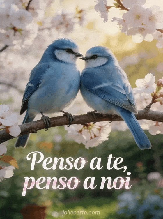 Penso a te penso a noi una tenera cartolina con due cinciarelle su un ramo di ciliegio per dire penso a te e a noi