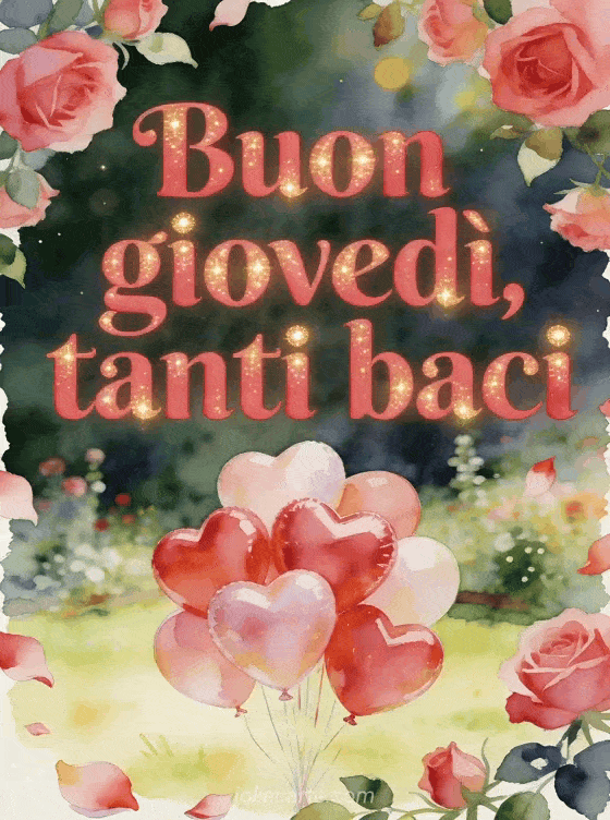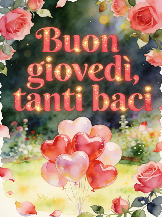 Condividi buon giovedì, tanti baci con lettere rosso rosa, palloncini a forma di cuore in una radura luminosa di giardino, rose e petali oltre il bordo. Scopri anche belle immagini per buon giovedì, buon giovedì soleggiato immagine o immagini per buon giovedì.