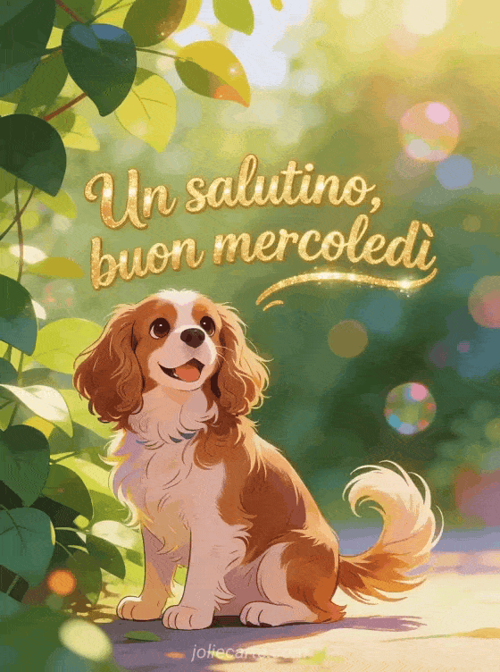 Invia un salutino caloroso di buon mercoledì con lettering giocoso, un cane Cavalier King Charles accanto a foglie illuminate dal sole, cerchi di bokeh morbidi e un'atmosfera colorata e allegra. Puoi vedere anche queste buon mercoledì immagini animate, questo buon mercoledì sotto la pioggia gif o questo buon mercoledì con vento.