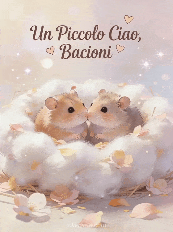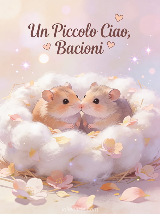 Invia questo adorabile piccolo ciao con bacioni per rallegrare la giornata di qualcuno. Due criceti soffici si sfiorano i musini in un nido accogliente. Scopri anche una cartolina ciao giallo o una cartolina ciao penso a te.