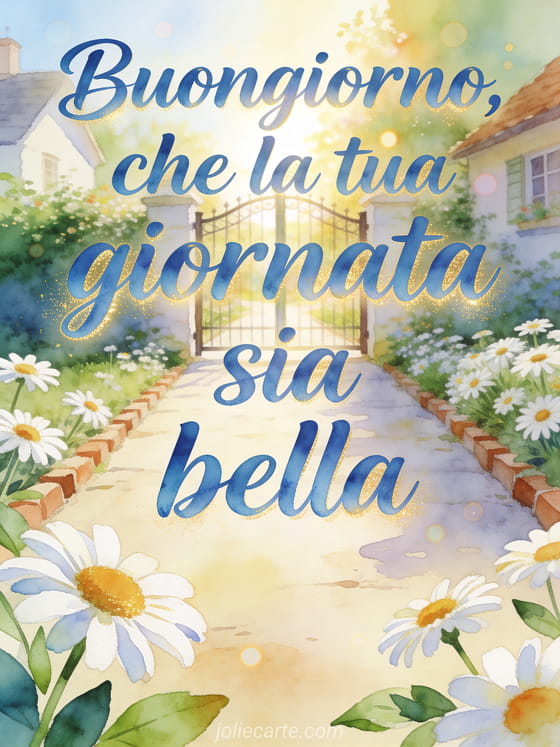 Invia un piccolo messaggio caloroso per buongiorno con lettere blu fluide ad acquerello, un cancello da giardino al sole, un sentiero luminoso verso una casa e margherite fresche. Scopri anche messaggio di buongiorno al suo caro, cartolina virtuale di buongiorno o messaggio di buongiorno per il mio uomo.