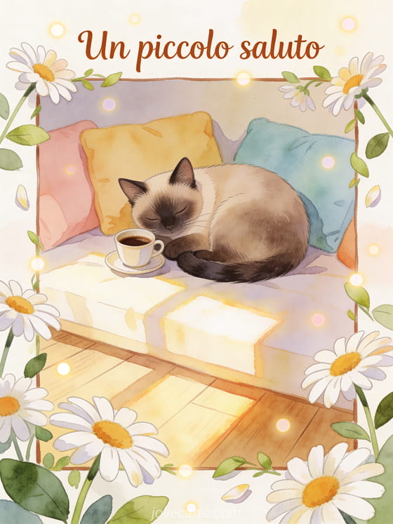 Condividi un dolce piccolo saluto con scritta marrone calda, petali di margherita, un gatto siamese, una tazzina di espresso e luce morbida del mattino. Scopri anche caffè buongiorno con alba, buongiorno tesoro mio caffè o mattina caffè caffè mattina buongiorno.