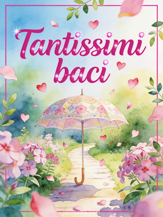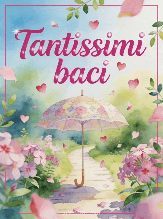 Invia tantissimi baci con un sentiero da giardino sotto un ombrello decorativo, petali a forma di cuore e fiori di phlox luminosi. Scopri anche ti mando tanti baci gif, mandare baci gif o pioggia di baci immagini.