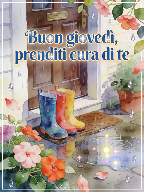 Condividi un biglietto premuroso di buon giovedì con una soglia sotto la pioggia, stivali da pioggia colorati, impatiens in fiore e pozzanghere brillanti. Puoi anche inviare piacevole giovedì baci, belle immagini per buon giovedì o una buon giovedì soleggiato immagine.
