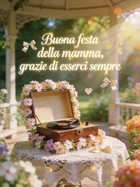 Ringrazia con un biglietto sognante che mostra un bordo fiorito di phlox attorno a un carillon aperto su un tavolo coperto di pizzo in un padiglione da giardino. Puoi inviare anche poesia per la festa della mamma, disegni per la festa della mamma o poesie per festa mamma.