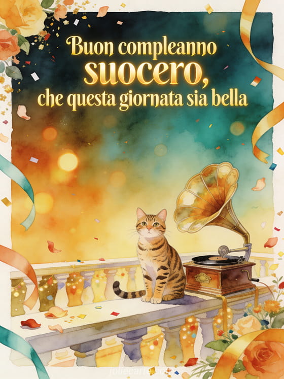 Invia una poesia buon compleanno suocero con lettere color champagne eleganti, un gatto bengal accanto a un grammofono vintage su una terrazza festiva, nastri, petali e coriandoli oltre il bordo. Scopri anche una poesia buon compleanno caro papĂ , una poesia di compleanno per papĂ ti voglio bene o una poesia per il suo papĂ per il suo compleanno.