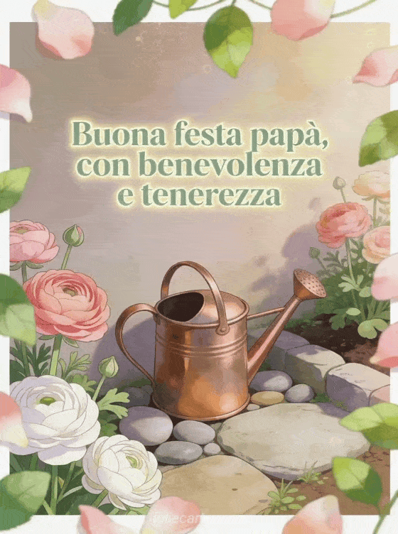 Invia una poesia tenera di buona festa papĂ con un angolo di giardino illustrato, un annaffiatoio di rame, pietre lisce, fiori di ranuncolo sovrapposti e foglie fresche in una palette calma e gioiosa. Scopri anche un biglietto gratuito per la Festa del PapĂ , buona festa papĂ immagine o parole affettuose per la festa del papĂ .