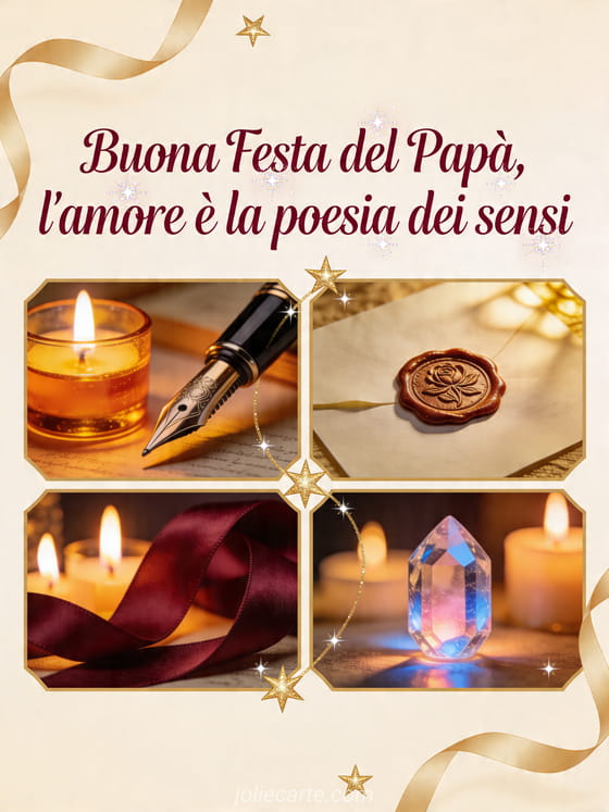 Condividi un biglietto raffinato per la Festa del Papà con atmosfera letteraria, scritta rubino, luce di candela, penna stilografica, sigillo di cera, nastro e cristallo. Invia un pensiero ispirato all'amore e alla poesia, e scopri anche una buona festa del papà immagine, buona festa papà mamma o una immagine festa del papà.