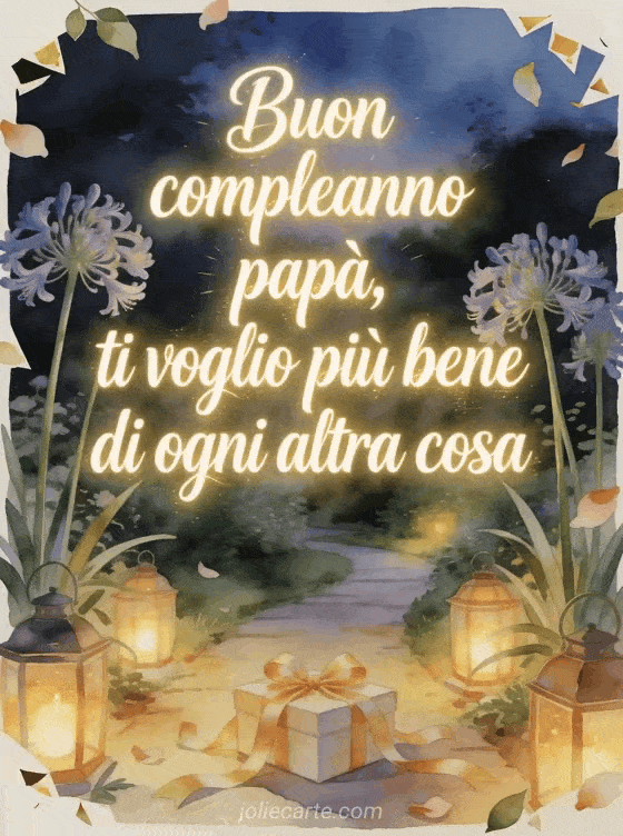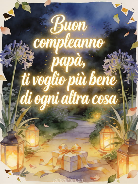 Condividi una poesia d'amore per papĂ per il suo compleanno con agapanti alti intorno a lanterne luminose e un regalo di compleanno con nastro su un sentiero in giardino. Puoi scegliere anche biglietto di compleanno per papĂ , poesia poesia papĂ buon compleanno o poesia di compleanno papĂ per bambino.