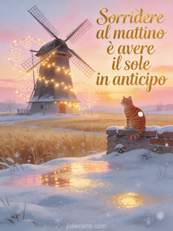 Invia un messaggio poetico del mattino con un pittoresco mulino a vento, campi innevati e un gatto rosso illuminato dall'alba. Scopri anche amicizia buongiorno messaggio del mattino, emilia-romagna carta e ciao mattutino.