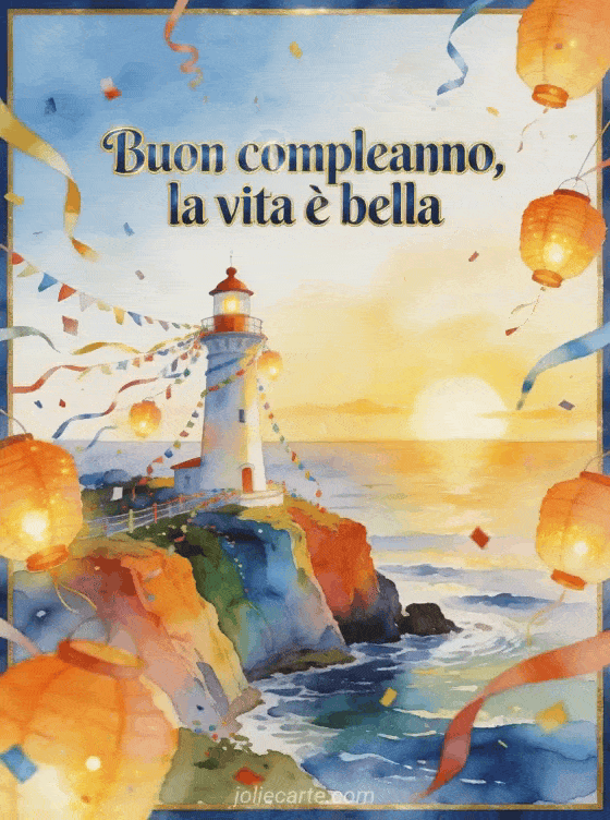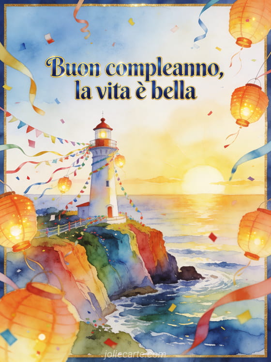 Invia un augurio di compleanno gioioso con un faro luminoso su scogliere colorate sopra il mare. Festoni, lanterne accese e coriandoli incorniciano un'alba radiosa ad acquerello e il messaggio che la vita è bella. Scopri anche un testo toccante per compleanno di mio figlio, una poesia per il compleanno di mio figlio o una poesia di compleanno per mio figlio.