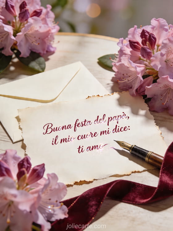 Invia una poesia per la festa del papĂ il mio cuore mi dice con una natura morta fotorealistica da scrittoio, penna stilografica, busta sigillata, grappoli di rododendro in fiore e nastro di velluto. Scopri anche disegno festa del papĂ , un biglietto virtuale Festa del PapĂ o un biglietto della Festa del PapĂ .